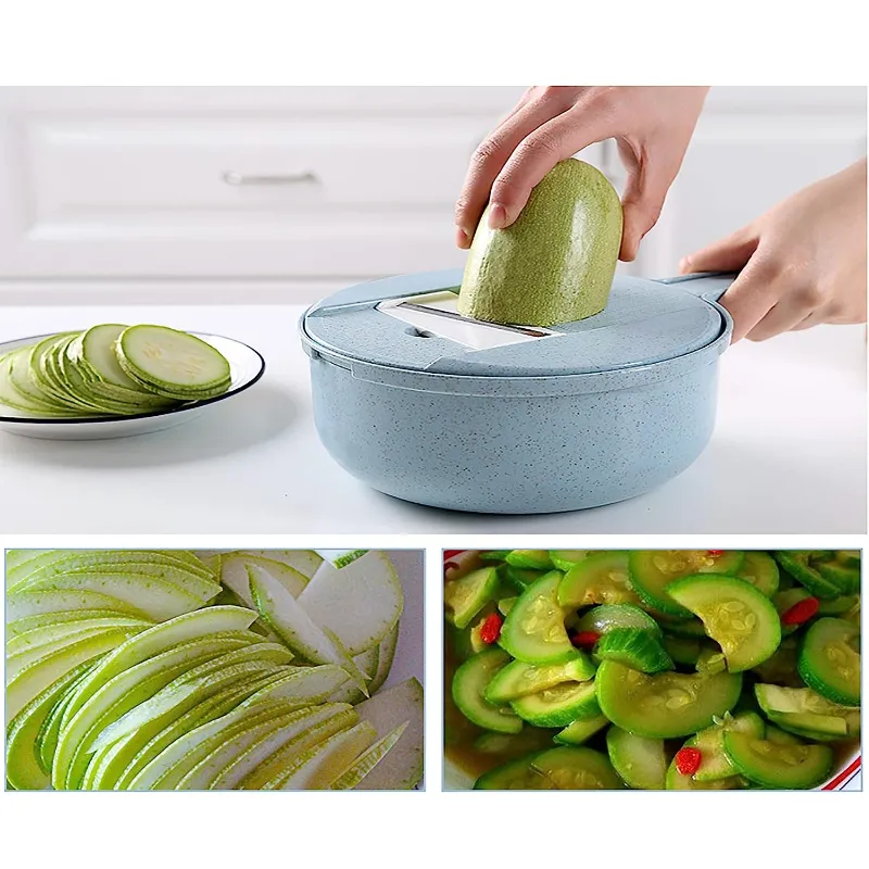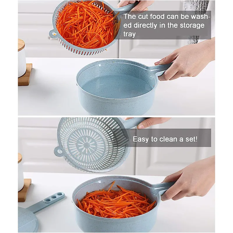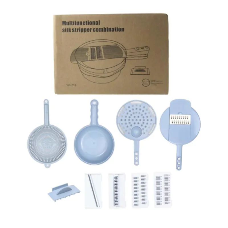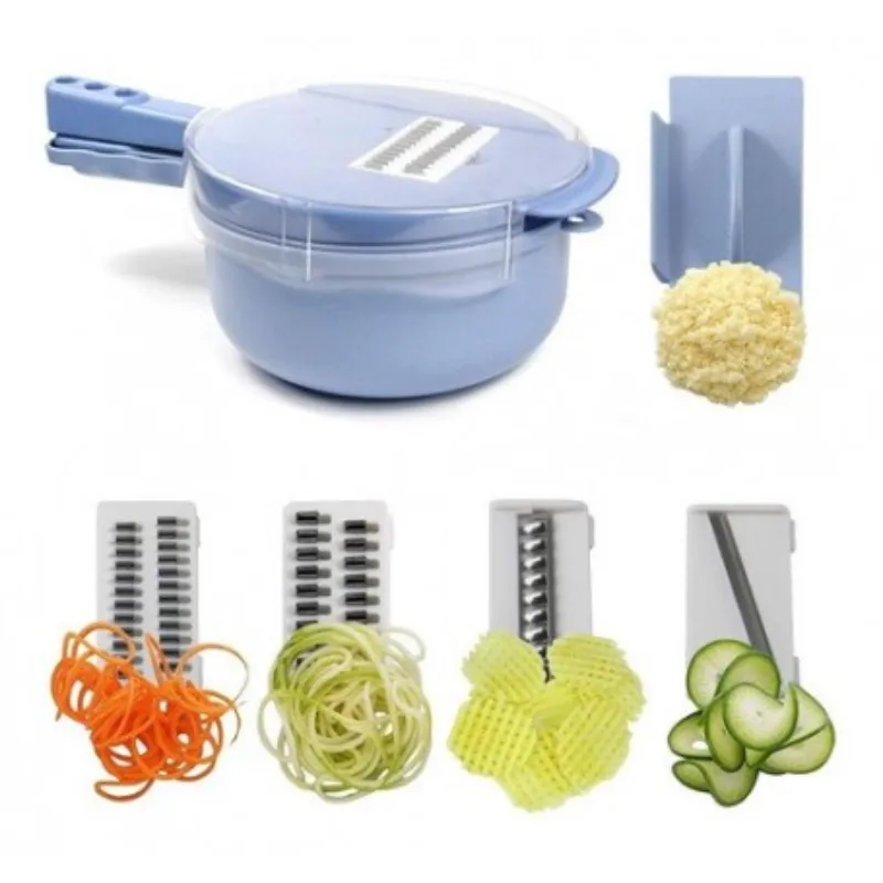 • El picador de verduras todo en uno contiene un recipiente para alimentos, una canasta de drenaje, una cortadora de verduras, cuchillas intercambiables, un molde protector para las manos, un separador de huevos y una tapa para mantener frescos. ¡Te permite tener una experiencia perfecta de cortar verduras en tu cocina!
